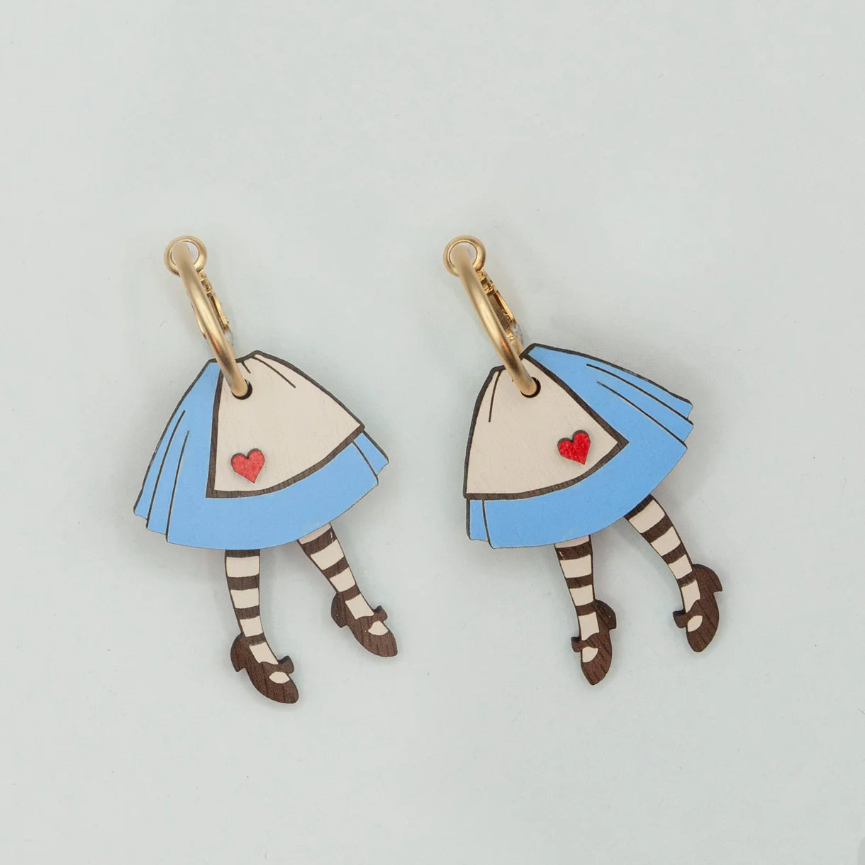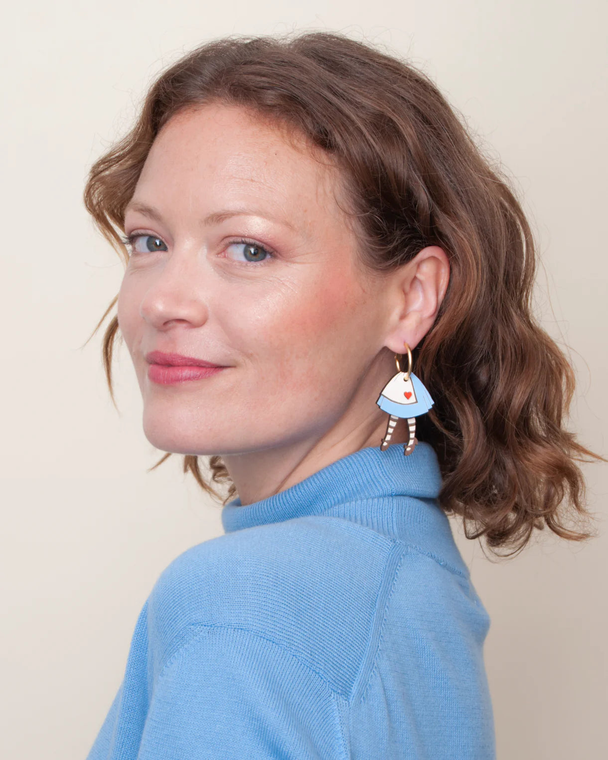 Estos pendientes presentan una reinterpretación juguetona de Alicia — capturada en pleno descenso, con su clásico vestido azul y medias de rayas. Un pequeño corazón rojo en el delantal añade un guiño encantador a los detalles de Wonderland.